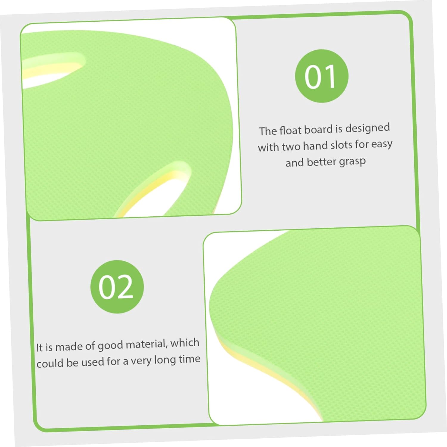 Package List 1 x Back Float 1 Board Characteristics - Size: 23.00X18.00X8.40cm/9.04X7.07X3.30in swimming buoy - Color: Green portable float - Size: 41.00X32.00X2.80cm/16.11X12.58X1.10in back float swim trainer -Material:EVA pool floating float - Comfortable and easy to grip while training or learning to swim, the handle increases grip and allows for different positions while training swim float for . - Creative design, is easy to grip, suitable for indoor swimming pool and beach. This is a nice have fun swimming in this hot summer swim board. - The swim float is manufactured with material for durable and reusable use swim float. - Adults and beginners can play for an outstanding swimming experience portable swimming kick board. - Fine workmanship and bright color ensures the and enjoyment. Selected EVA material, which is not easy to overturn kick board.Goods Informationswimming buoy If you are looking for a swim float with reliable performance and reasonable , I will tell you that our product will be .swim float for We adopt EVA material, can keep it for a long time. back float swim trainer Meanwhile, it owns a special and attractive appearance design