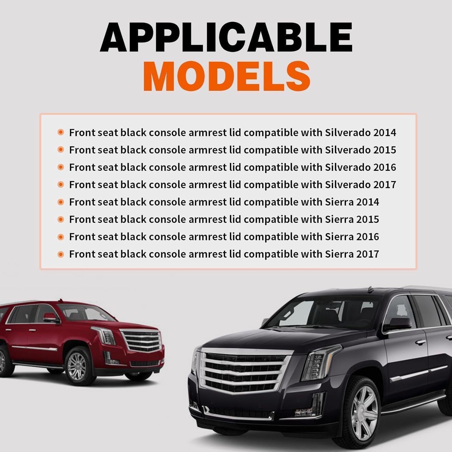 Fitments - Front seat black console armrest lid compatible with 2014 2015 2016 2017 2018 2019 Silverado 1500 2500HD 3500HDFront seat black console armrest lid compatible with 2015 2016 2017 2018 2019 2020 SuburbanFront seat black console armrest lid compatible with 2015 2016 2017 2018 2019 2020 TahoeFront seat black console armrest lid compatible with 2014 2015 2016 2017 2018 2019 Sierra 1500 2500HD 3500HDFront seat black console armrest lid compatible with 2015 2016 2017 2018 2019 2020 YukonFront seat black console armrest lid compatible with 2015 2016 2017 2018 Escalade ESVFront seat black console armrest lid compatible with 2015 2016 2017 2018 2019 2020 EscaladeProduct Detail - Color: BlackMaterial: PU LeatherPlacement on Vehicle: Front centerFitment Type: Direct replacementPackage Contents - 1*Front seat black console armrest lidAdvantages - Provide comfortable elbow support to relieve arm fatigue during driving or sitting; at the same time, seal the central armrest storage compartment to avoid items from falling out, and keep the storage area tidyMatch the interior design and dimensions of the vehicle, repair the appearance defects of the glove compartment cover, restore the regular state of the vehicle's center console, and enhance the overall aesthetic appeal of the interior